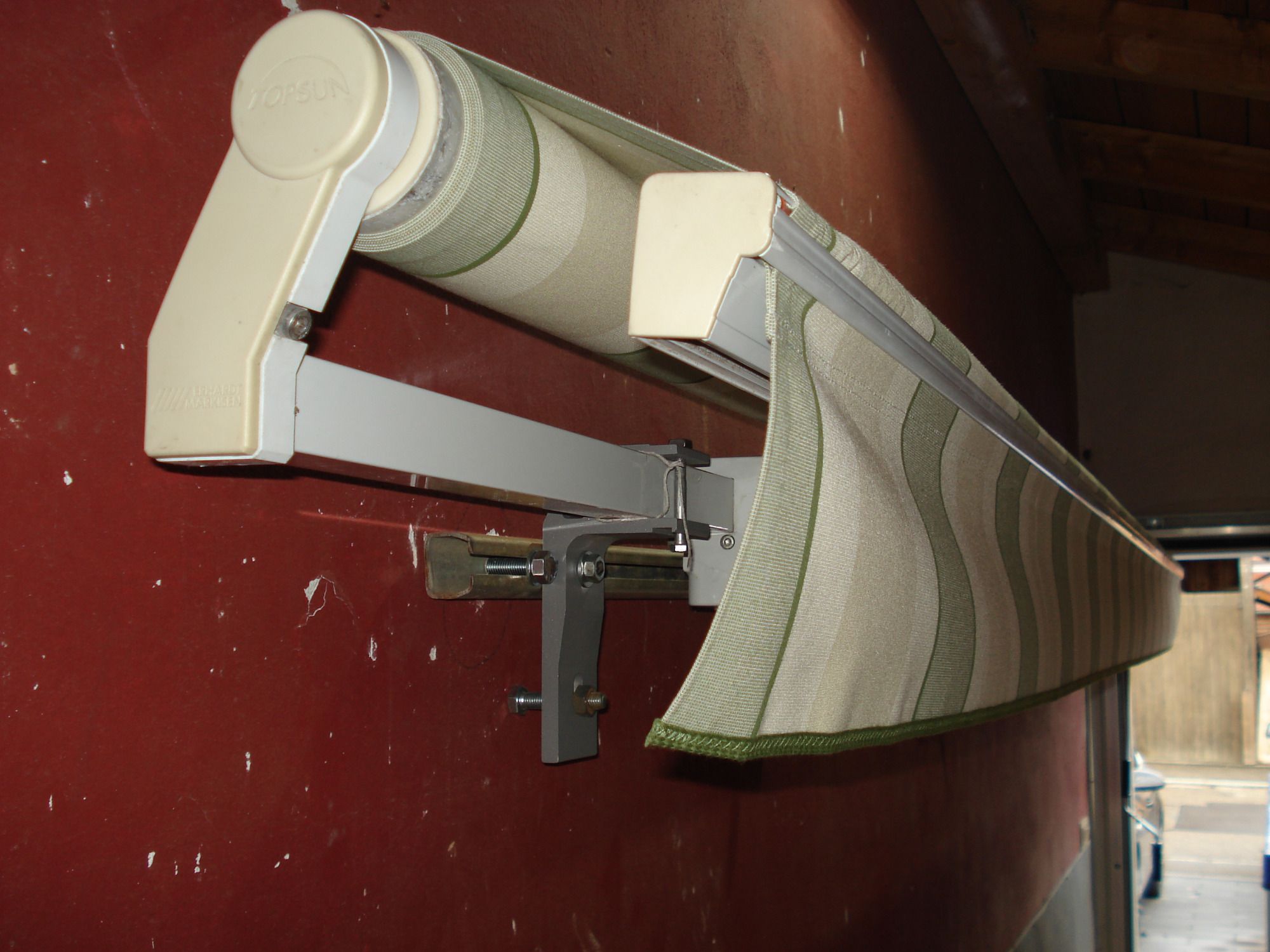 Die Markise hat ein weißes Gestell und einen neuen roten Stoff. 370 cm breit x 250 cm Ausfall. Der Antrieb ist manuell und von außen gesehen links. Auf Wunsch kann dieser auch gegen einen Funkmotor ausgetauscht werden.